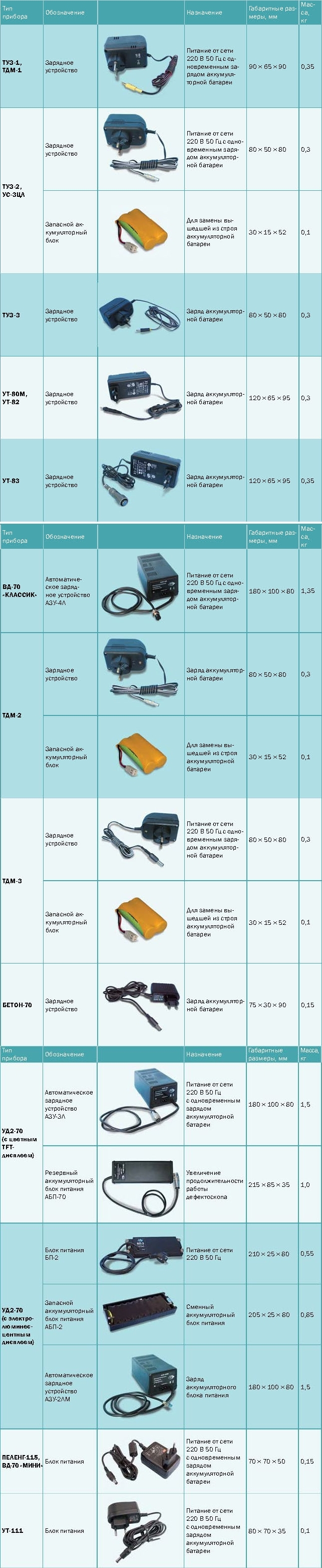 Блоки питания и зарядные устройства необходимы для подключения оборудования для неразрушающего контроля к сети электропитания. Благодаря им аппаратура снабжается током, необходимым для функционирования. Некоторые изделия применяют для зарядки аккумуляторных батарей. Выбор аксессуара производят в соответствии с моделью используемой техники.