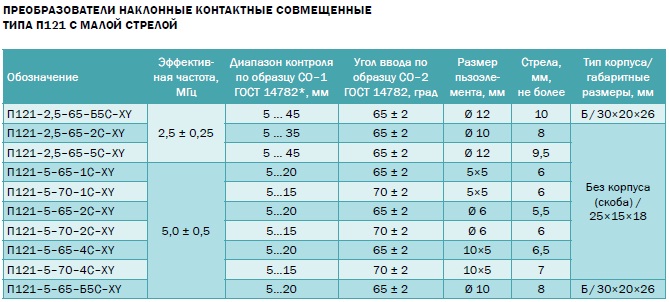 Преобразователи наклонные контактные совмещенные типа П121 с малой стрелой