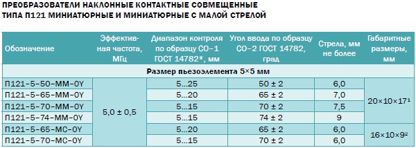 Преобразователи наклонные контактные совмещенные типа П121 миниатюрные и миниатюрные с малой стрелой