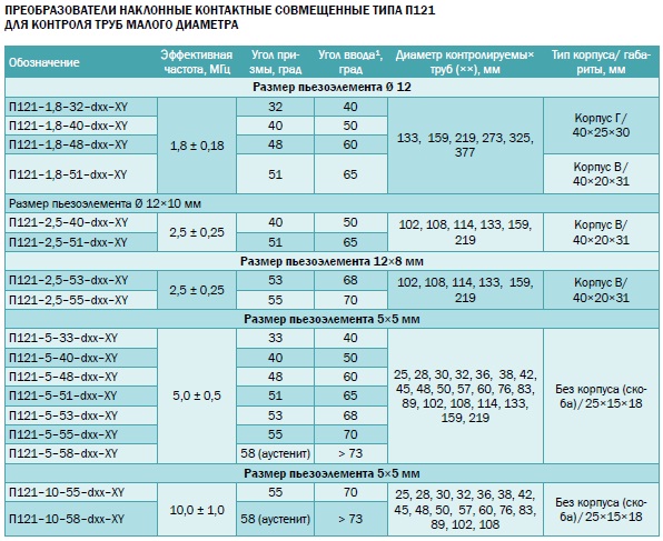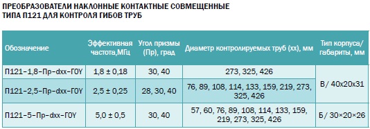 Преобразователи наклонные контактные совмещенные типа П121 для контроля гибов труб