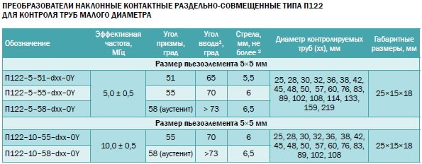Преобразователи наклонные контактные раздельно-совмещенные типа П122 для контроля труб малого диаметра
