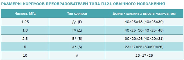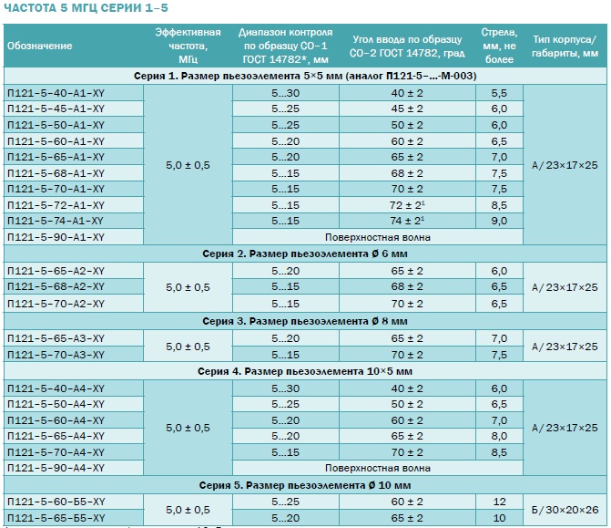 Преобразователи наклонные контактные совмещенные типа П121 (частота 5 МГц серии 1–5)