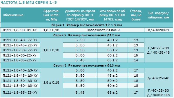 Преобразователи наклонные контактные совмещенные типа П121 (частота 1,8 МГц серии 1–3)