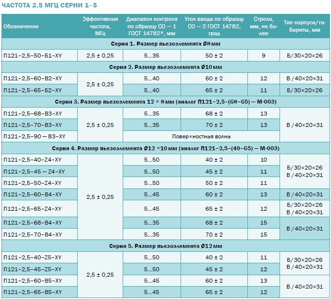 Преобразователи наклонные контактные совмещенные типа П121 (частота 2,5 МГц серии 1–5)